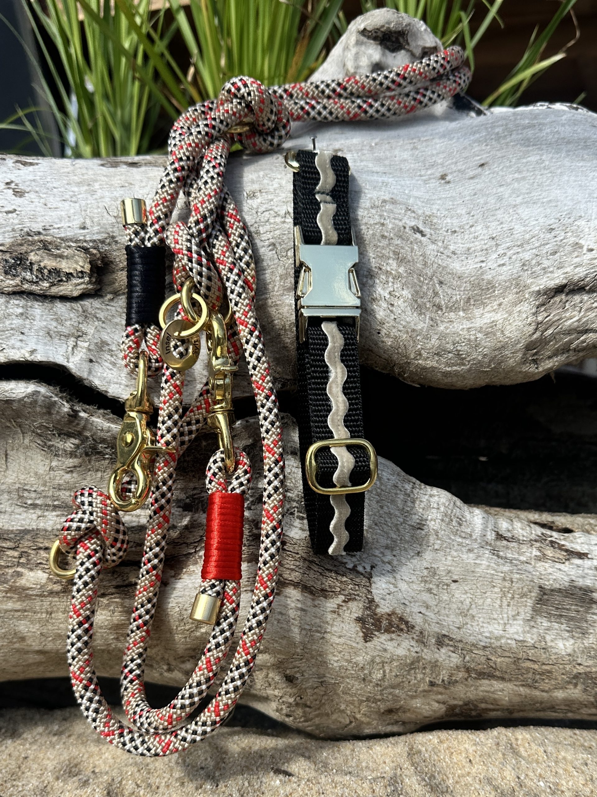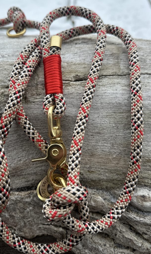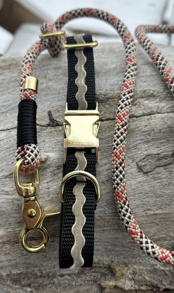 2cm goldene Metallschnalle und ein Samtband auf Gurtband genäht Verstellbar von 25 bis 38cm Leine 8mm Stärke mit zweifarbiger Takelung und 1,80m Länge