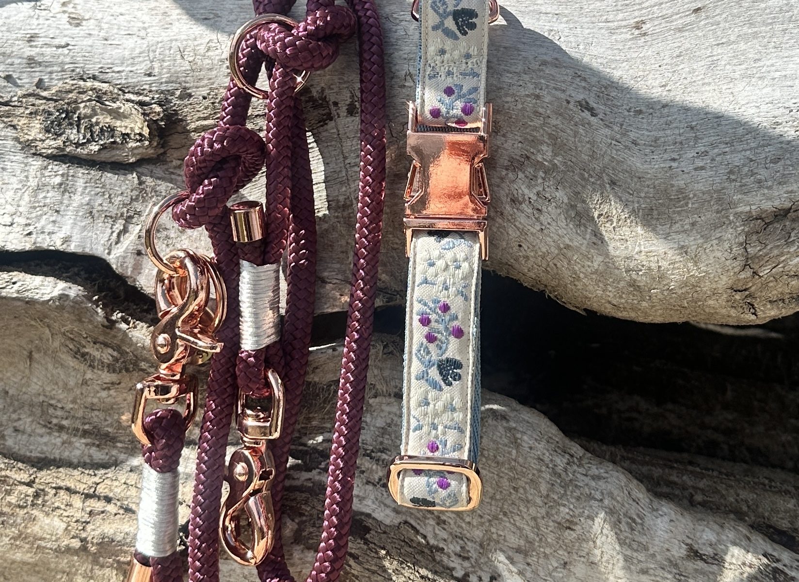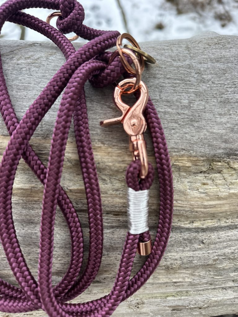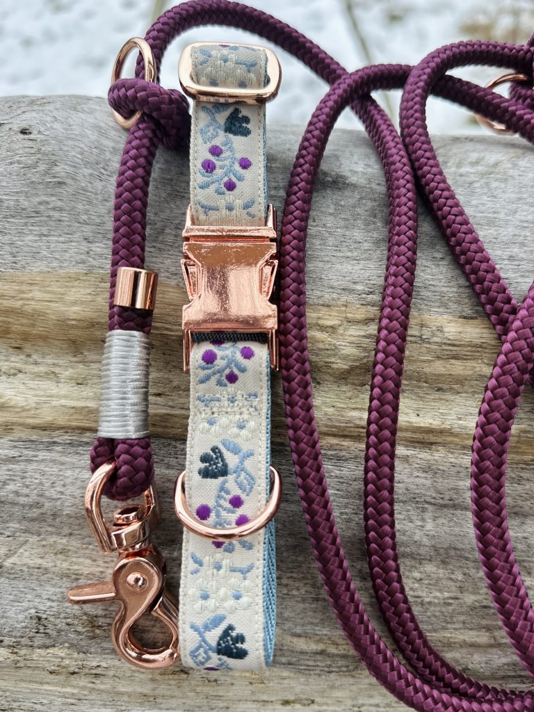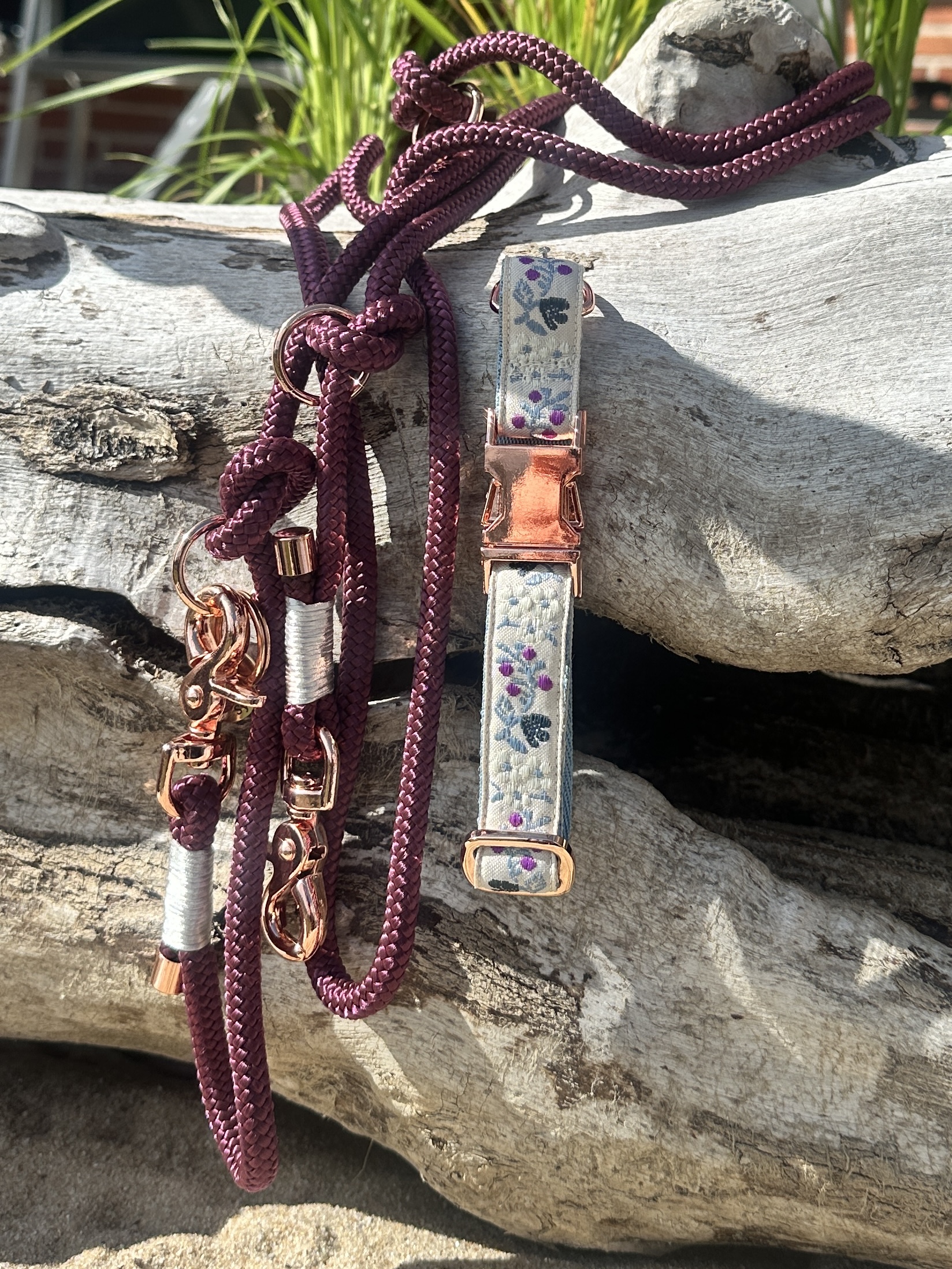 2cm roségoldene Metallschnalle und ein Webband auf Gurtband genäht Verstellbar von 25 bis 38cm Beerenfarbene Leine in 8mm Stärke mit hellgrauer Takelung und 1,80m Länge
