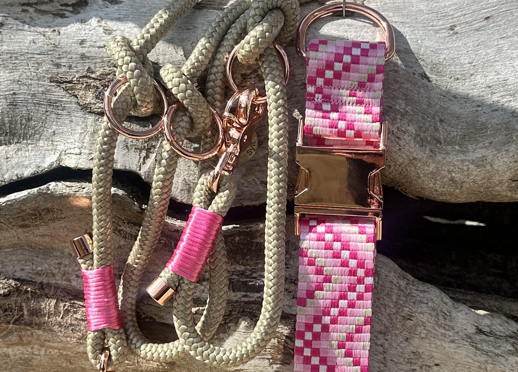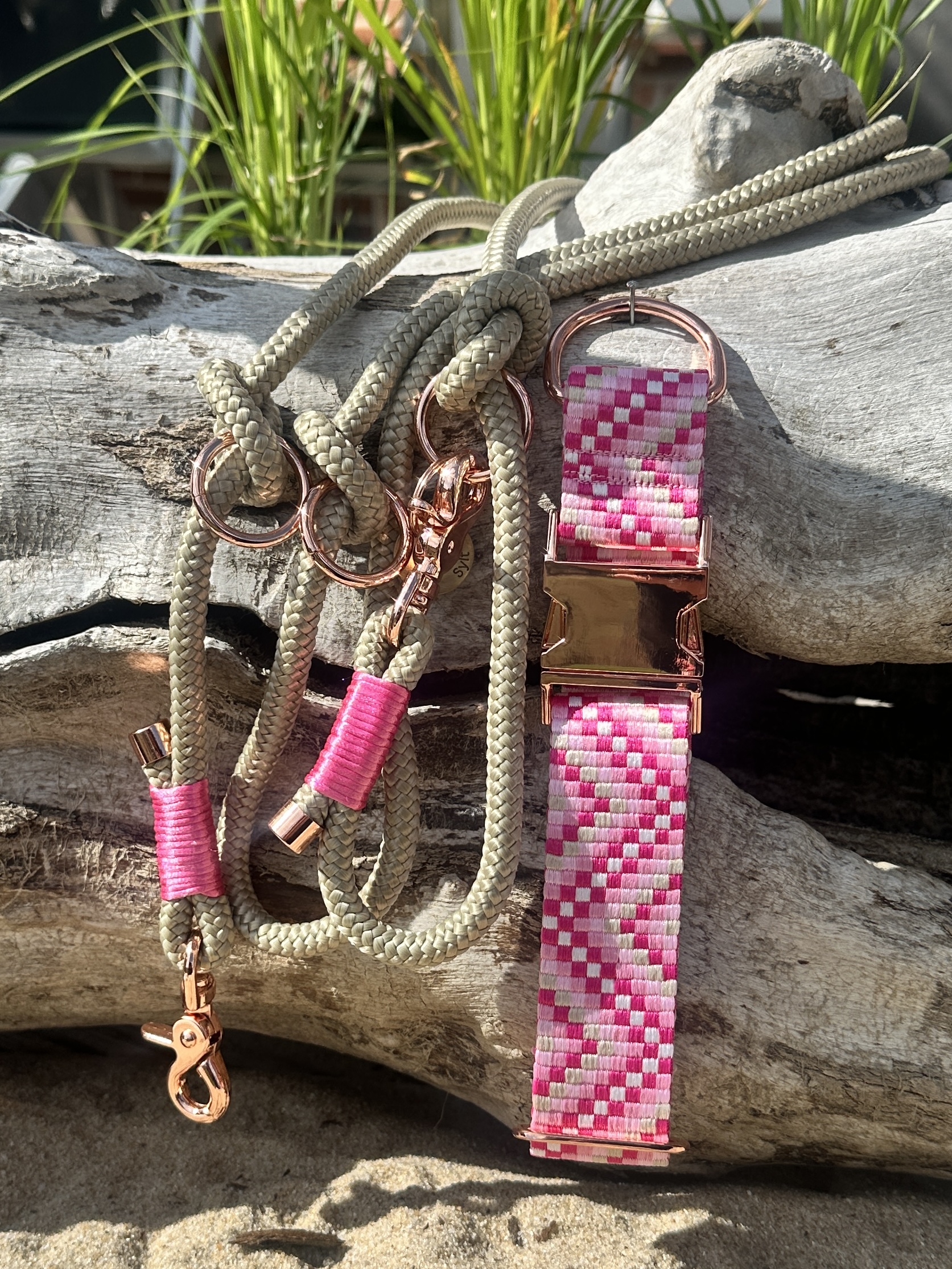 4cm roségoldene Metallschnalle und ein Gurtband in 3 Farben Verstellbar von 35 bis 53cm Beigefarbene Leine in 10mm Stärke mit Takelung in Pink und 1,80m Länge