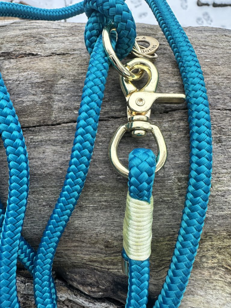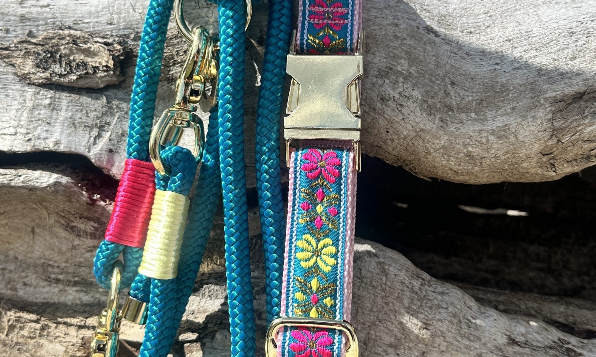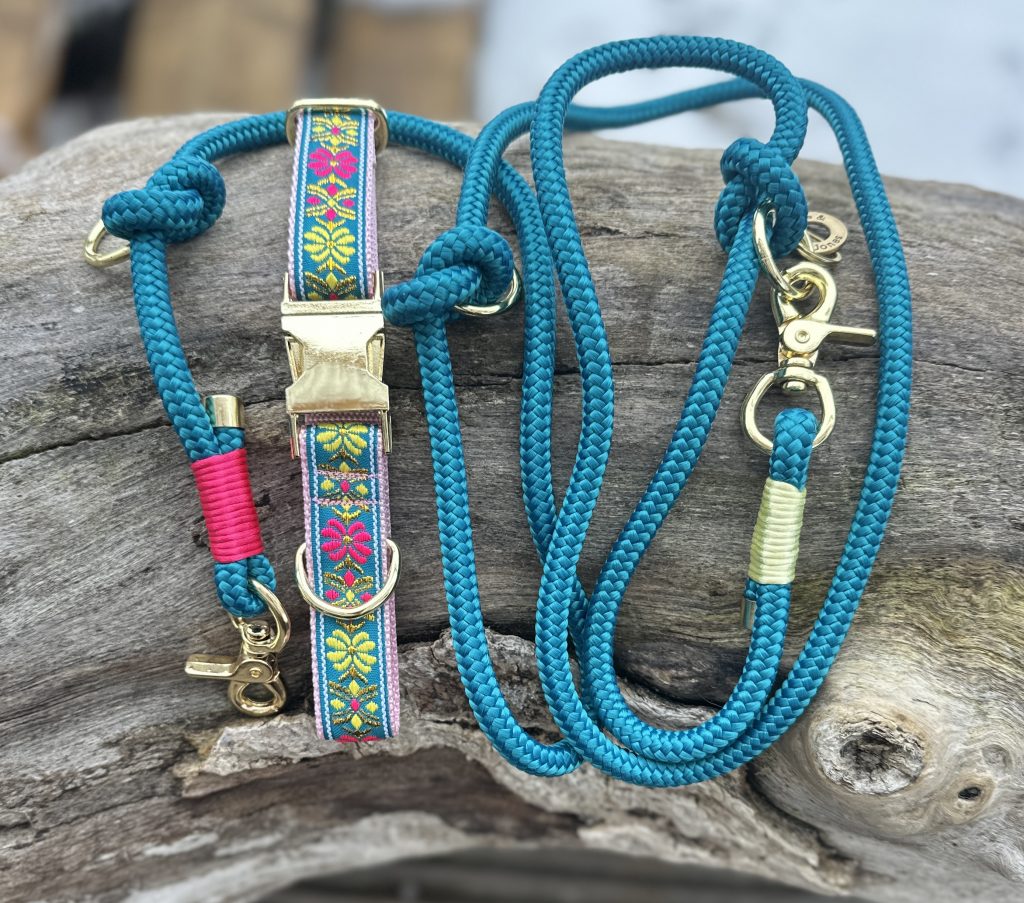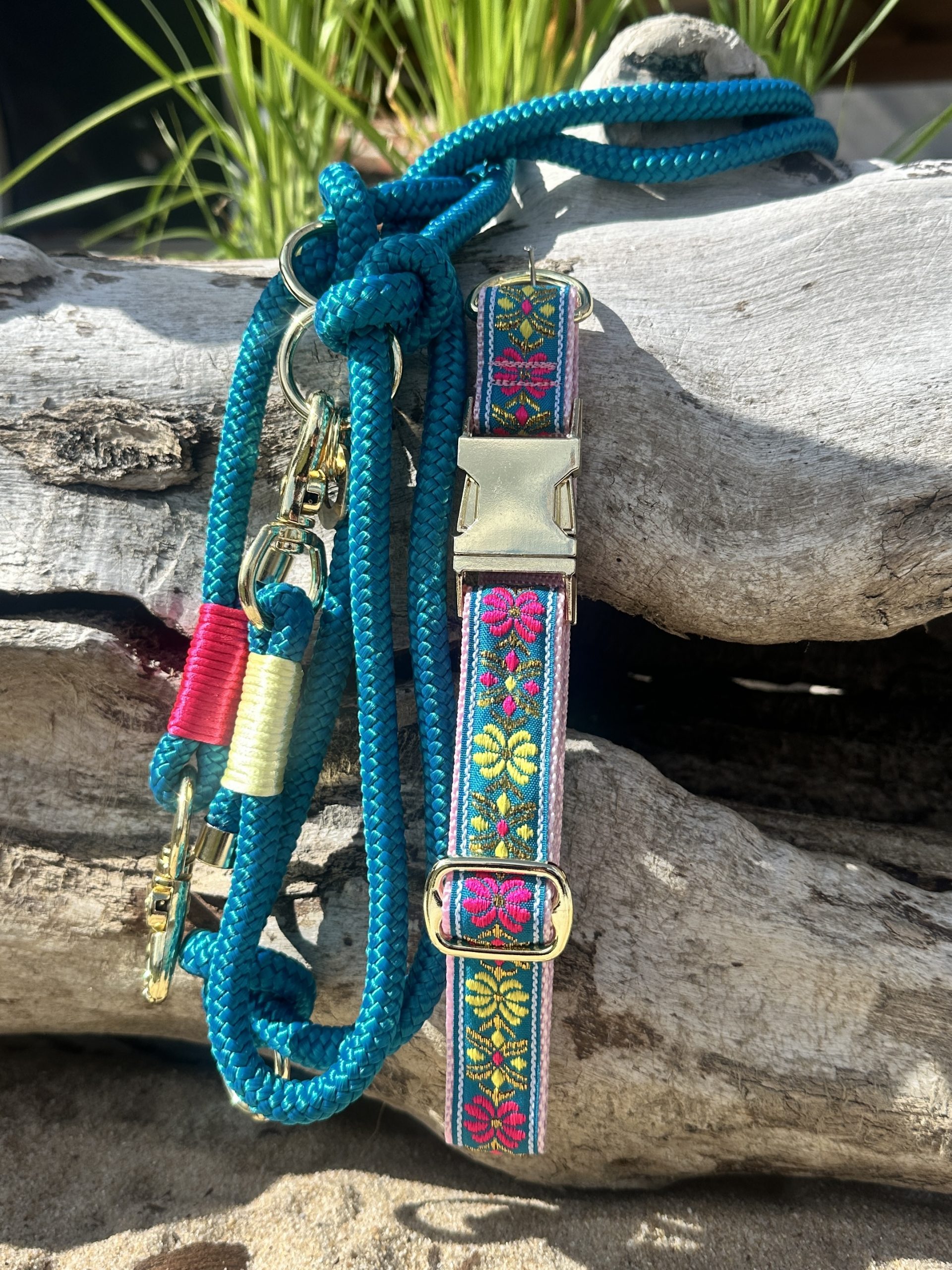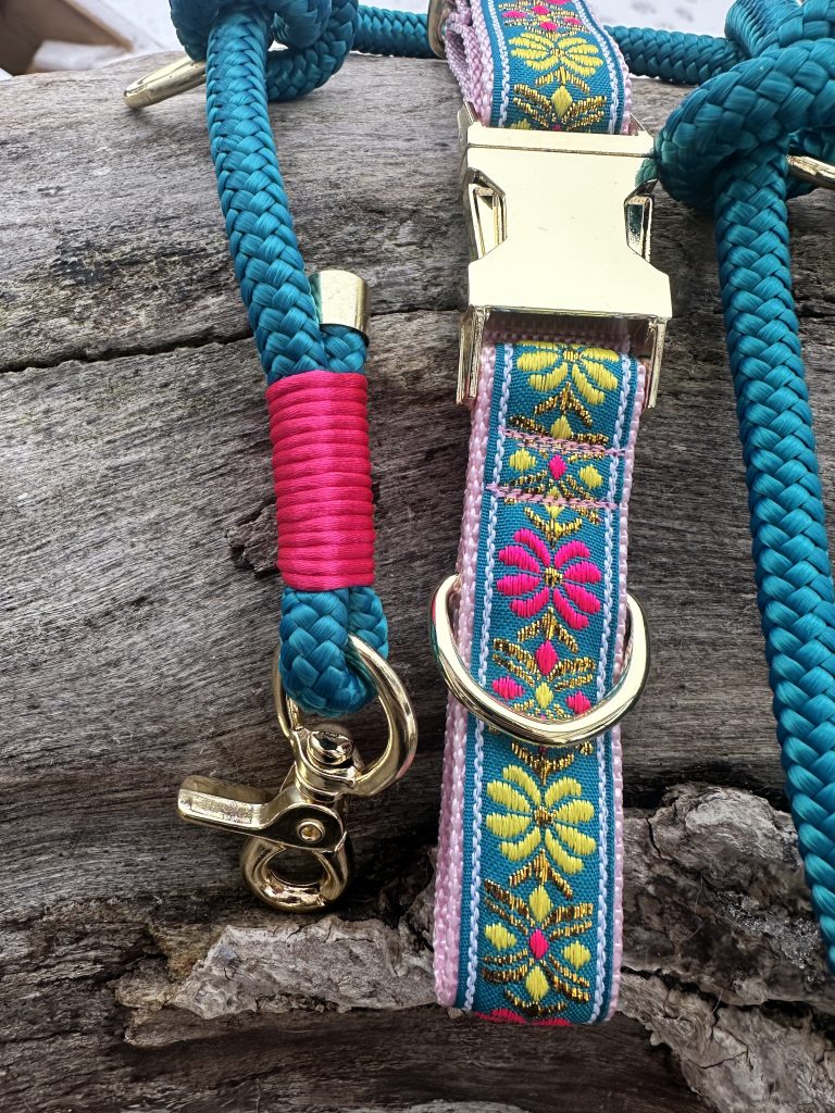 2,5cm goldene Metallschnalle und ein Webband auf Gurtband genäht mit bunten Blumen und Goldapplikationen Verstellbar von 30 bis 50cm Türkisfarbene Leine in 10mm Stärke mit zweifarbiger Takelung und 1,80m Länge