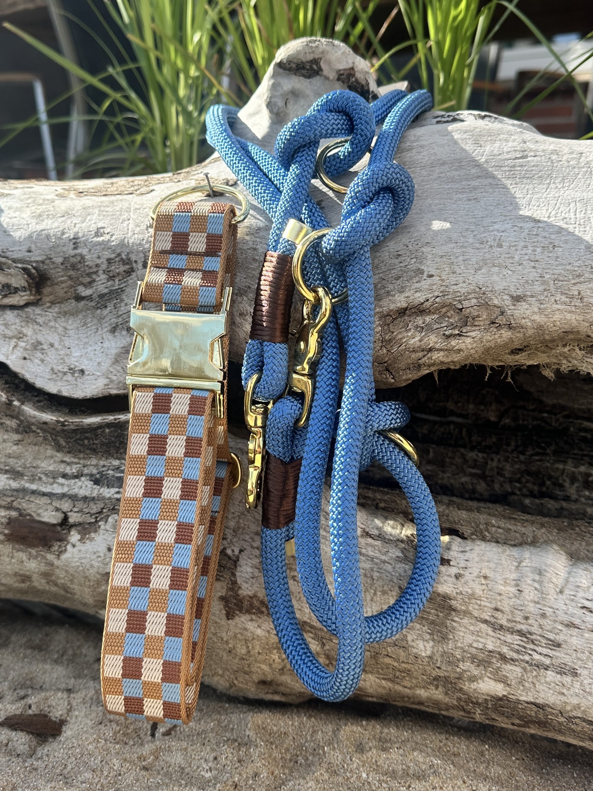 Blaue Leine in 10mm Stärke mit brauner Takelung und 1,80m Länge