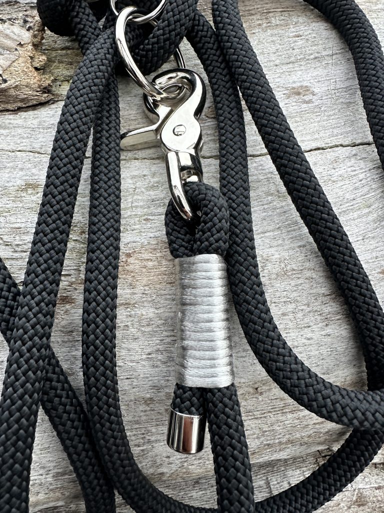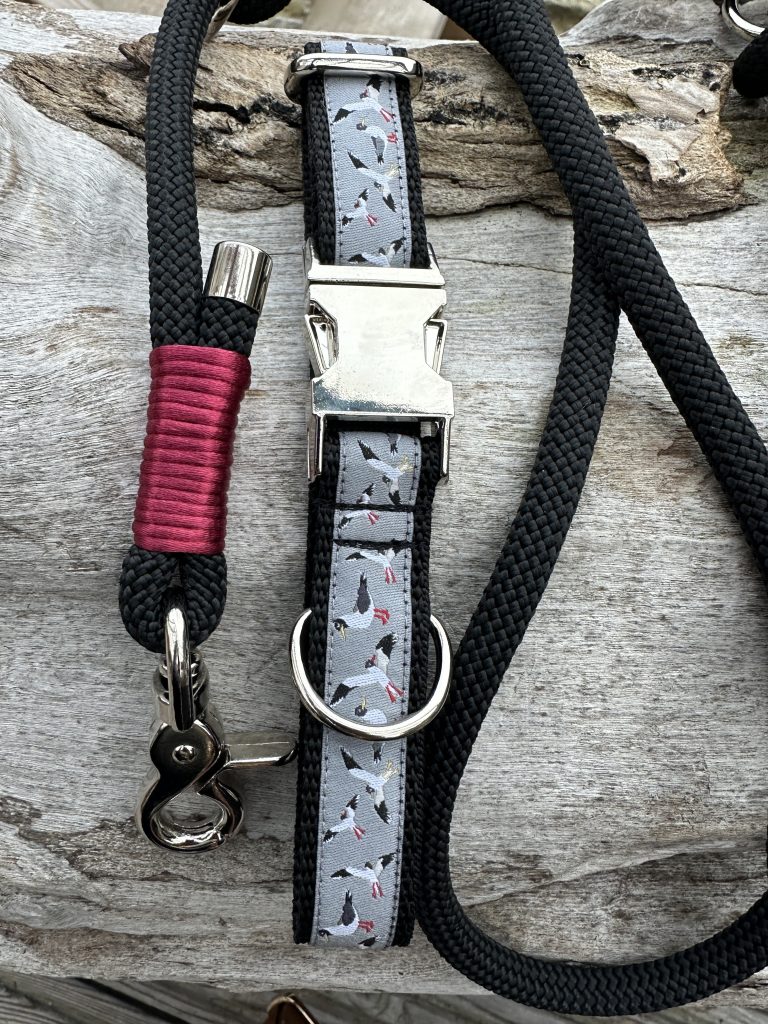 2cm silberfarbene Metallschnalle und ein Webband auf Gurtband genäht mit MöwenmotivVerstellbar von 25 bis 35cm Schwarze Leine in 8mm Stärke mit zweifarbiger Takelung und 1,80m Länge