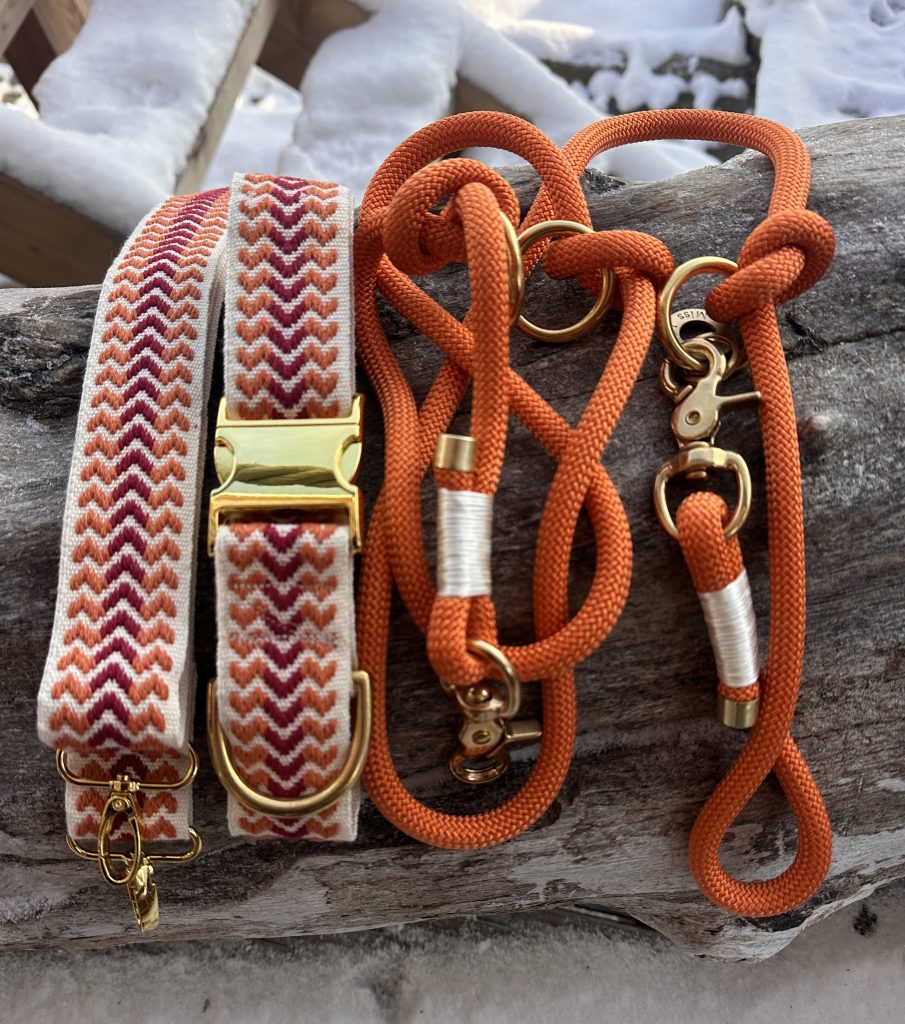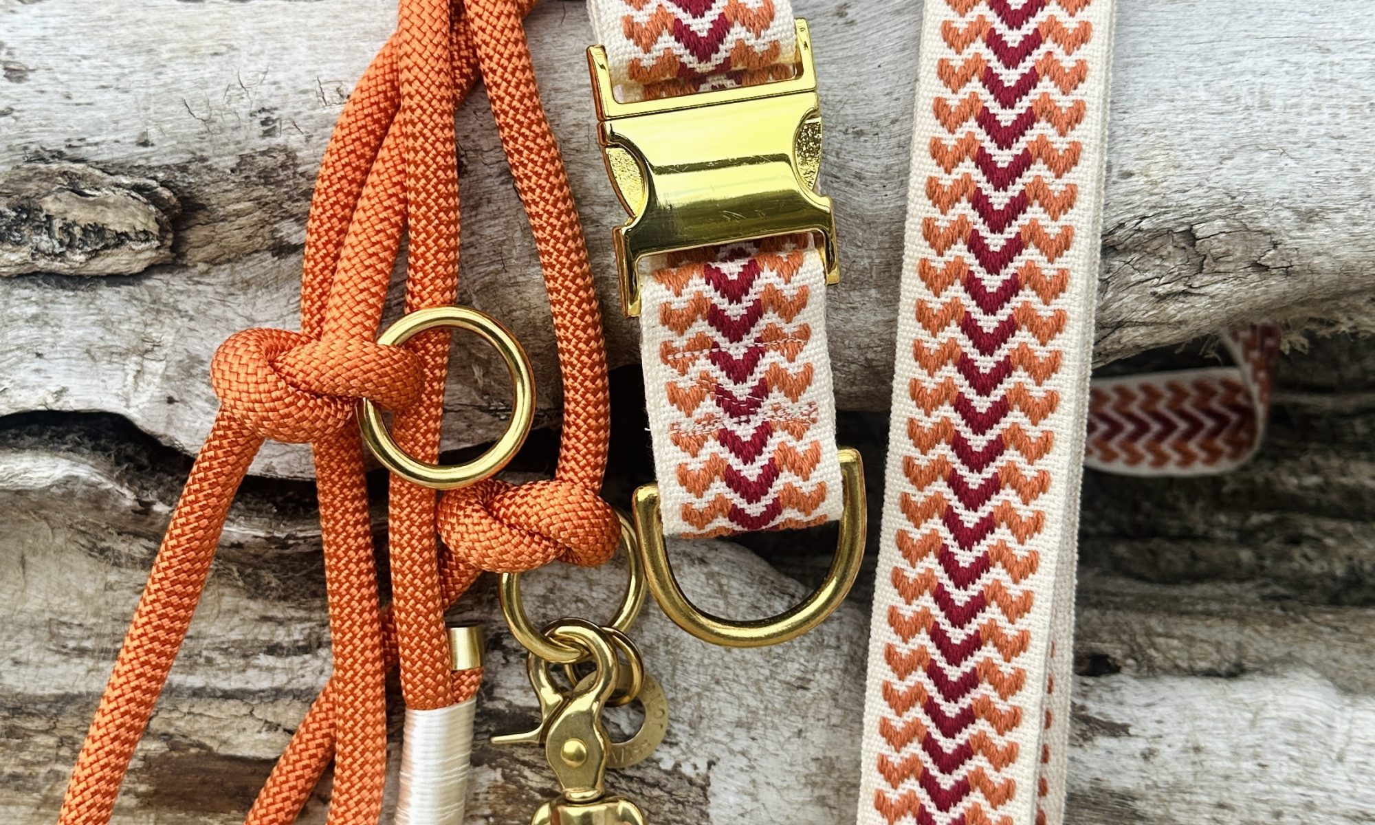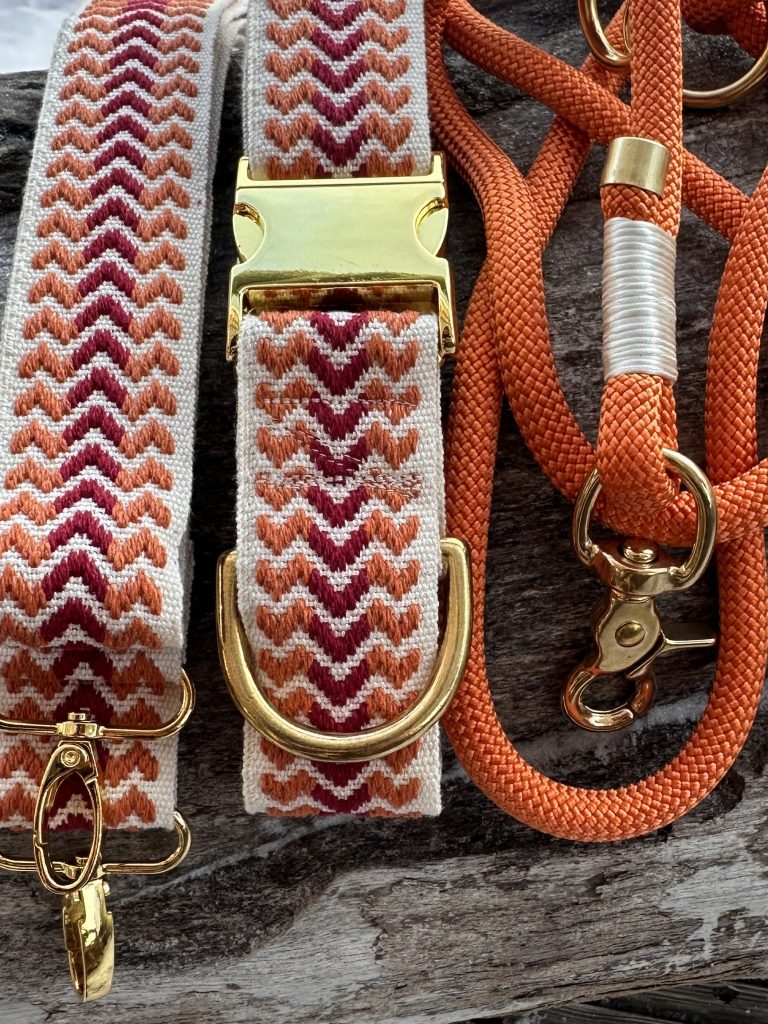 Das Halsband aus Baumwollmix hier in 3,8 cm Breite verstellbar von 45 bis 65 cm. Hardware aus Messing, Leine in 10mm Breite mit Takelung in Creme. Das Set gibt es mit dem passenden Taschengurt. Einzelstück