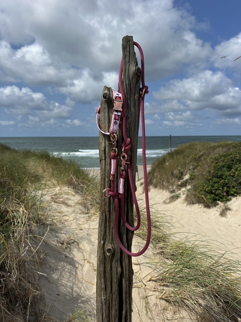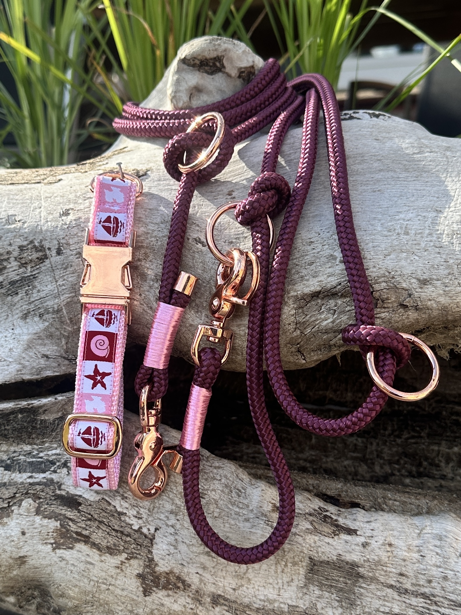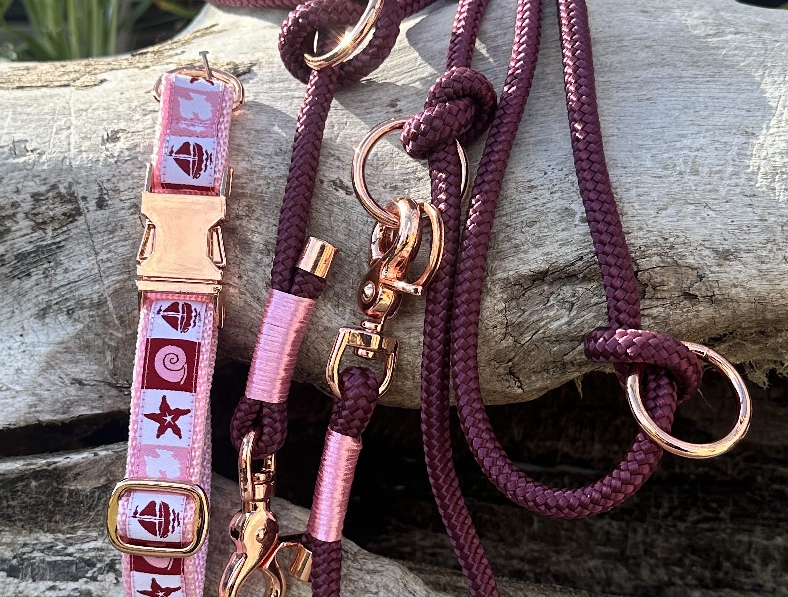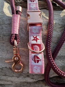Set für kleinere Hundemädchen mit einer 2 cm breiten Metallschnalle in Rosé Gold.Webband auf Gurtband genäht mit rosa Takelung